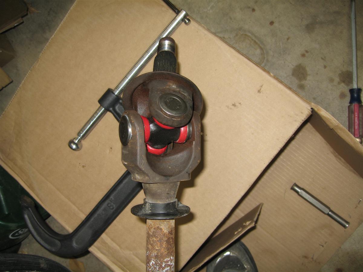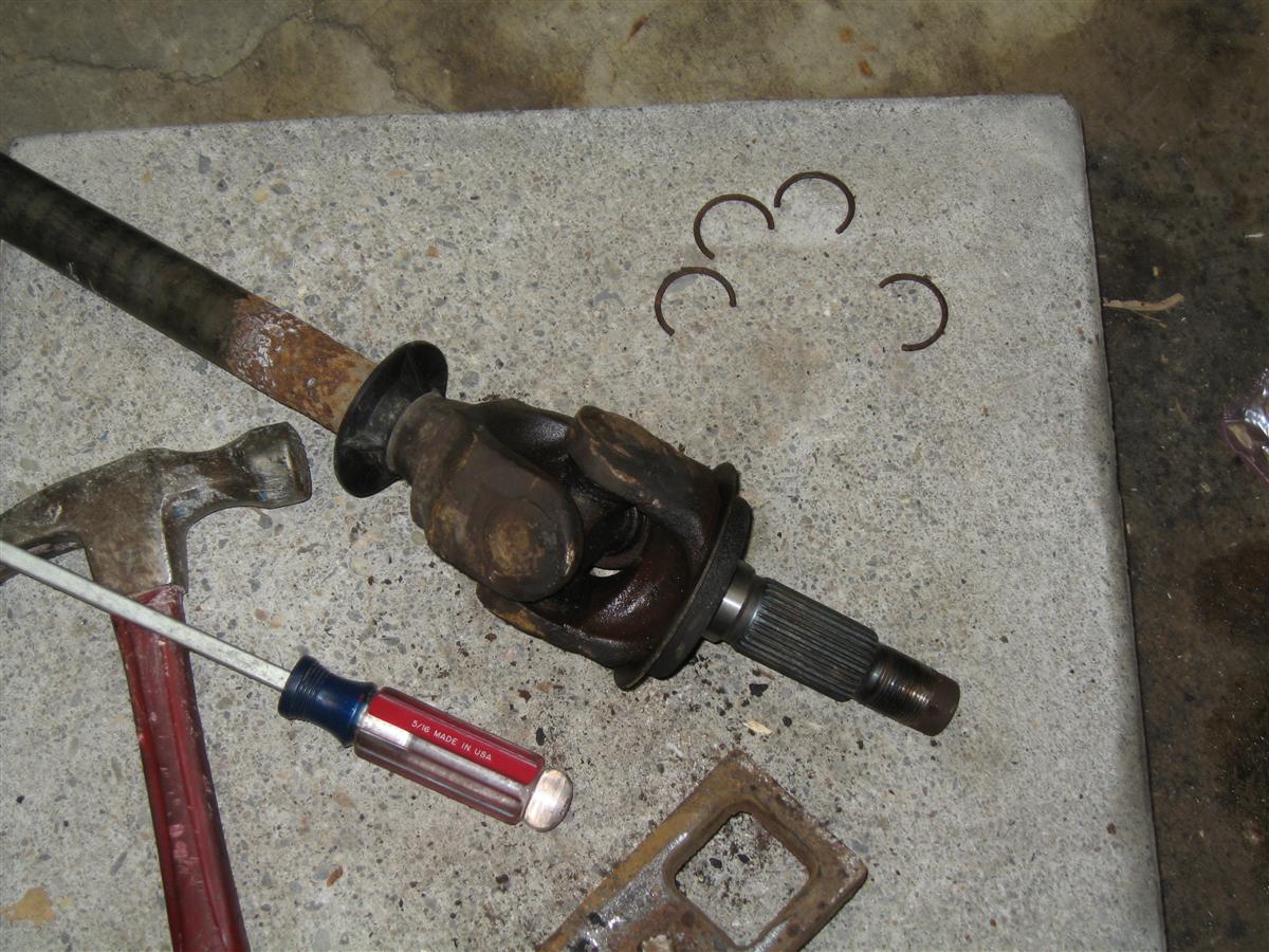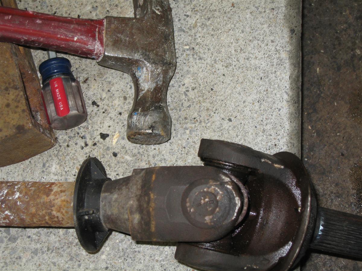 Replacing the U Joints are not as hard as they look. Once you get the assembly on your workbench the process is really quite easy. You shouldn't have much trouble whether you are using a press or just hammering them out. I just used a BFH and they came right out. Here is how I did it: