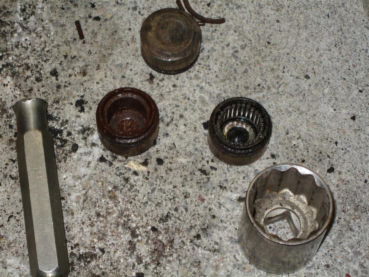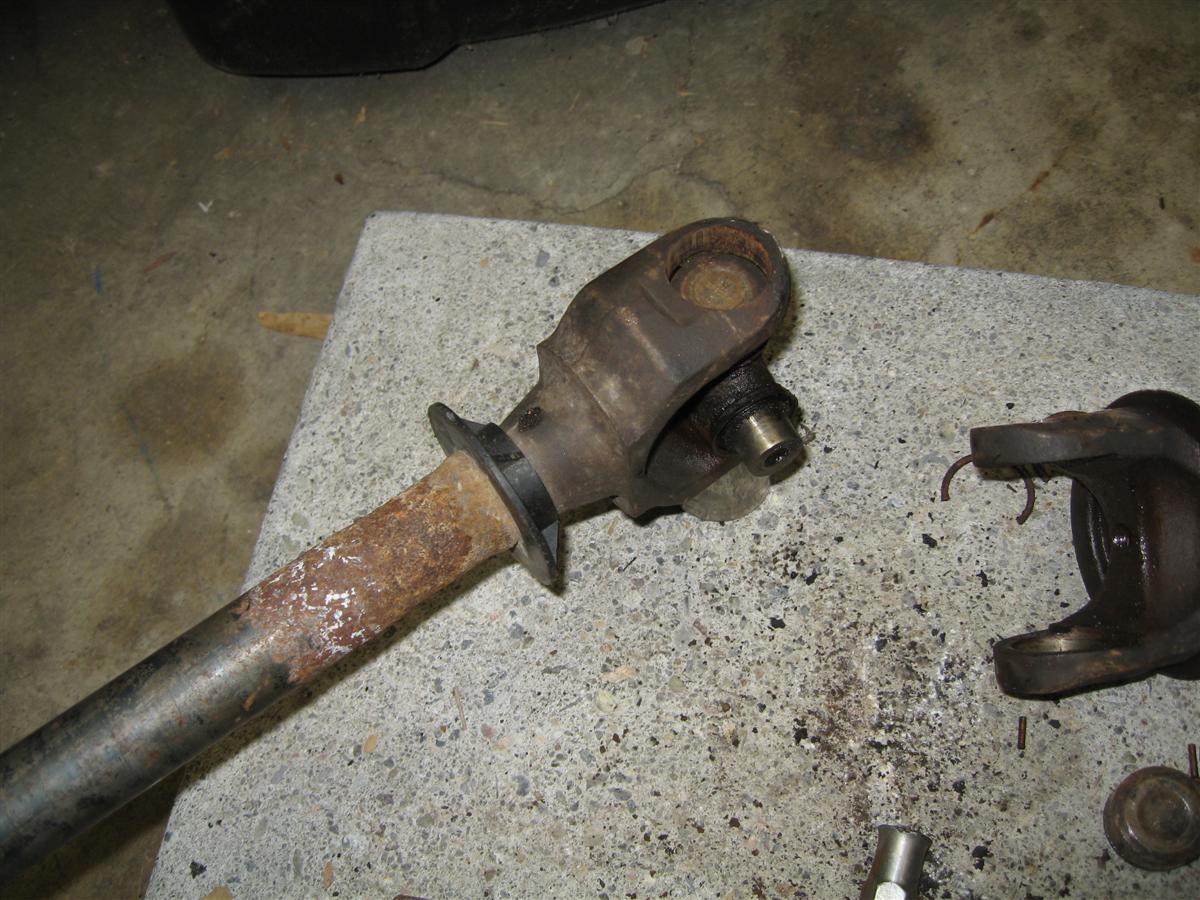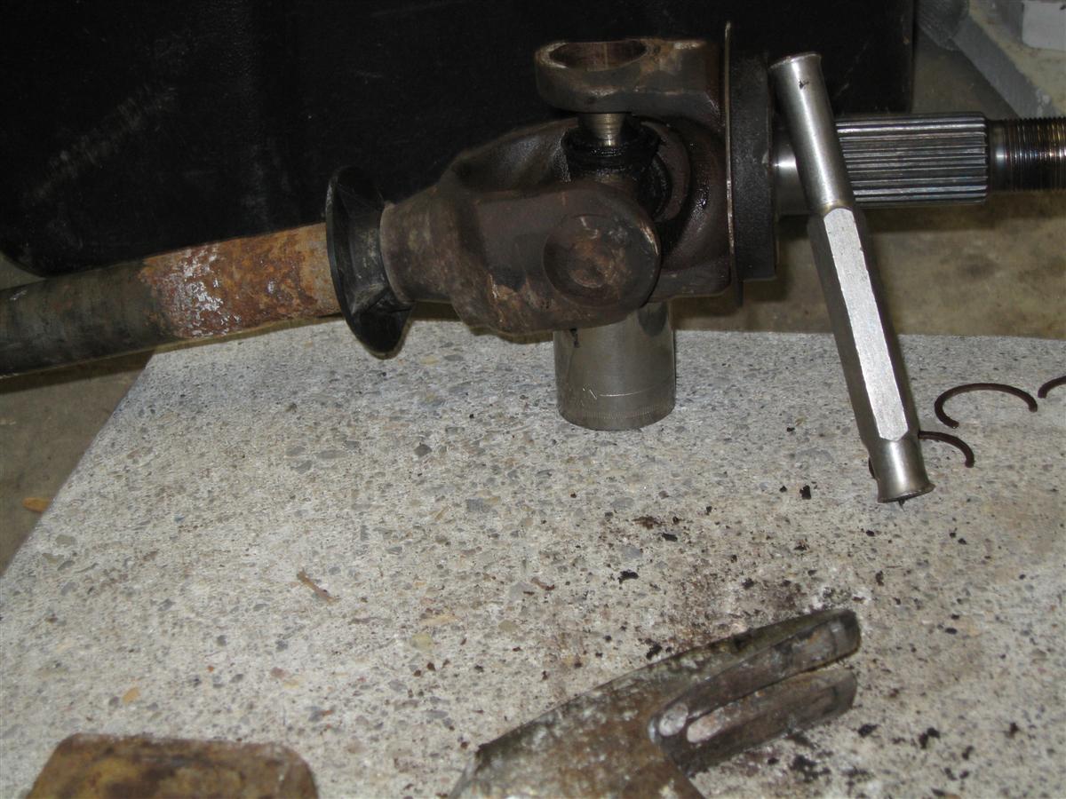 Replacing the U Joints are not as hard as they look. Once you get the assembly on your workbench the process is really quite easy. You shouldn't have much trouble whether you are using a press or just hammering them out. I just used a BFH and they came right out. Here is how I did it: